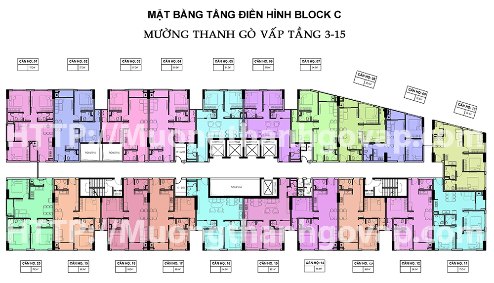 Blog C: Diện tích: 4.763 m2, cao 15 tầng (1 tầng hầm, 1 tầng dịch vụ, 20 căn hộ/sàn (53,5m; 55,4m; 61,6m; 63,1m; 64,5m; 64,6m; 66m; 66,6m; 67,2m; 75,2m; 79,2m ).